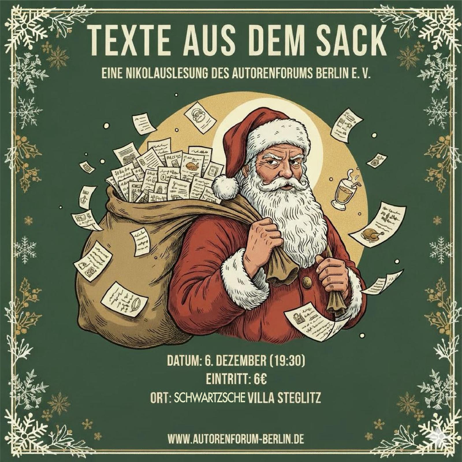 Das Autorenforum Berlin e. V. lädt am 6.12.2025 herzlich zur Nikolauslesung Texte aus dem Sack ein! Ein Abend mit vielen unkonventionellen Weihnachtsgeschichten, die den Blick auf das Fest neu beleben werden.